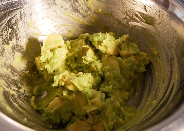 2.アボカドを1cm角くらいに角切りにカットし、レモン汁(小さじ1)と塩・ブラックペッパーを少々加えて、軽くつぶしながら混ぜます。