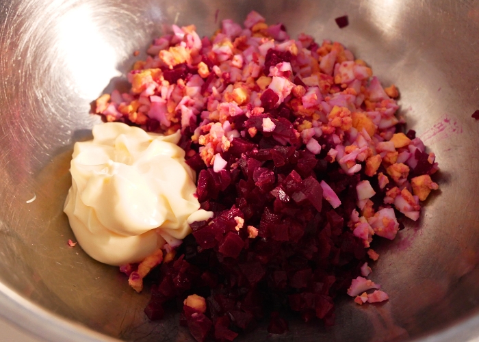 3.ビーツと玉ねぎピクルスの汁を切ったものを、5ml角くらいにみじん切りにします。ゆで卵も同じく、5ml角くらいにみじん切りにします。ビーツと玉ねぎピクルスとゆで卵を、マヨネーズ(大さじ2)とブラックペッパーを少々加えて混ぜます。