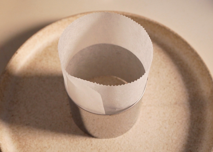7.冷やした後、そっとセルクルをぬいて、クッキングシートをはずします。