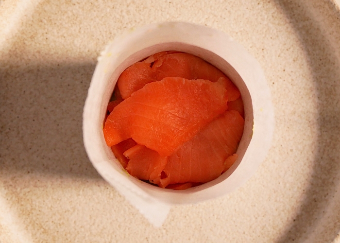 5.次に、アボカドの上にスモークサーモンを敷き詰めます。